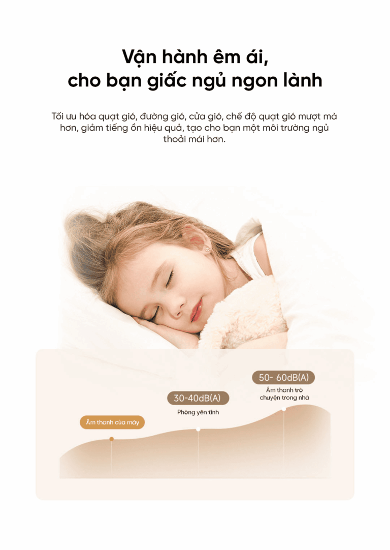 Vận hành êm ái giúp bạn có giấc ngủ sâu và dễ chịu hơn. Hệ thống quạt, đường dẫn gió và cửa gió được tối ưu hóa để luồng gió thổi ra nhẹ nhàng, êm mượt, đồng thời giảm thiểu tiếng ồn đáng kể. Nhờ đó, máy hoạt động yên tĩnh, mang đến không gian nghỉ ngơi thoải mái và thư giãn tuyệt đối.