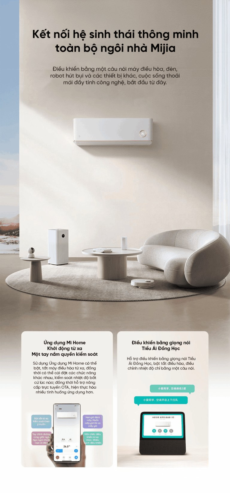 Kết nối trọn vẹn với hệ sinh thái thông minh Mijia, mang đến trải nghiệm tiện nghi và hiện đại cho ngôi nhà của bạn. Chỉ với một câu lệnh, bạn có thể điều khiển máy điều hòa, đèn, robot hút bụi và nhiều thiết bị khác. Cuộc sống trở nên dễ dàng, thoải mái và đậm chất công nghệ – tất cả bắt đầu từ hệ sinh thái Mijia.