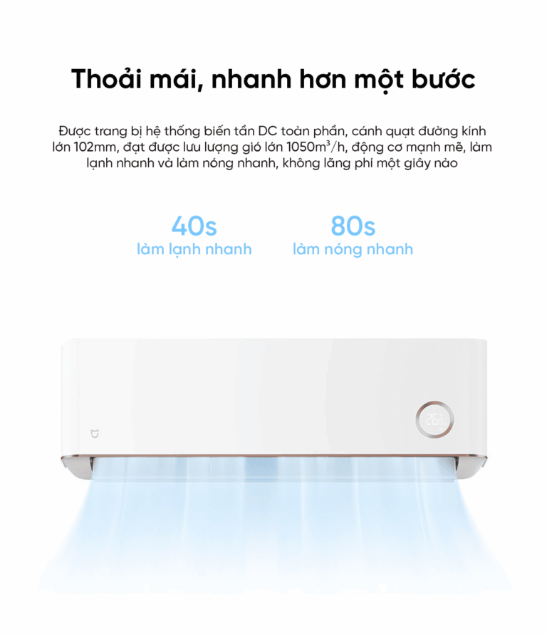 Máy được trang bị hệ thống biến tần DC toàn phần cùng cánh quạt đường kính lớn 102mm, mang đến lưu lượng gió mạnh mẽ lên tới 1050m³/h. Nhờ đó, không khí được lưu thông nhanh, làm lạnh chỉ trong 40 giây và làm nóng trong 80 giây. Hiệu suất vượt trội giúp bạn tận hưởng cảm giác dễ chịu ngay lập tức mà không cần chờ đợi.