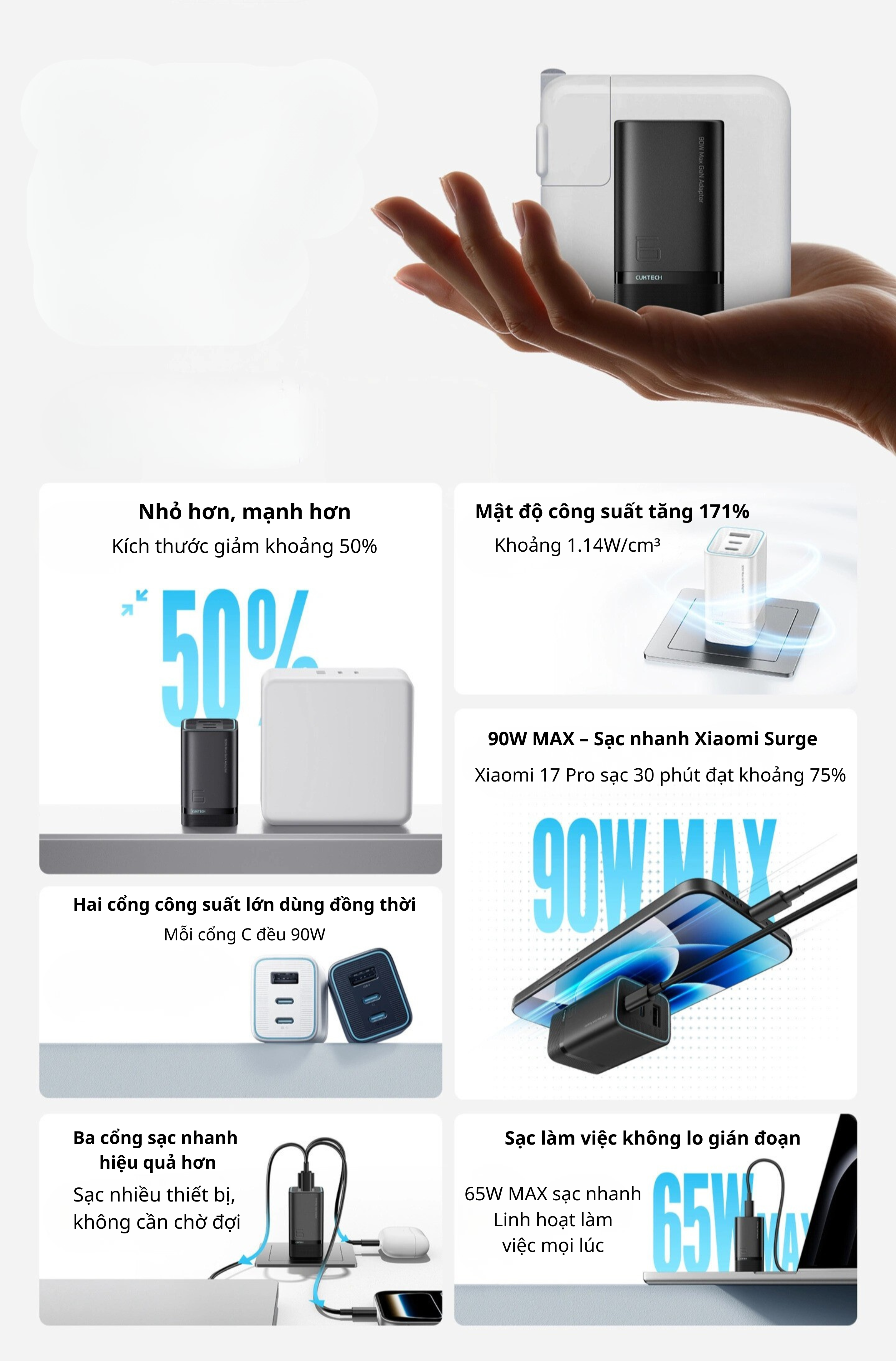 CUKTECH Bộ sạc số 6 Mini sở hữu thiết kế nhỏ gọn hơn khoảng 50% nhưng lại mạnh mẽ vượt trội với mật độ công suất tăng đến 171% (~1.14W/cm³). Sản phẩm hỗ trợ sạc nhanh 90W MAX với công nghệ Xiaomi Surge, cho khả năng sạc Xiaomi 17 Pro đạt khoảng 75% chỉ trong 30 phút. Trang bị hai cổng USB-C công suất lớn (mỗi cổng tối đa 90W) cùng tổng cộng ba cổng sạc nhanh, giúp sạc nhiều thiết bị cùng lúc mà không cần chờ đợi. Ngoài ra, bộ sạc còn hỗ trợ mức 65W MAX, đáp ứng tốt nhu cầu sạc laptop, đảm bảo công việc luôn liền mạch, không gián đoạn.