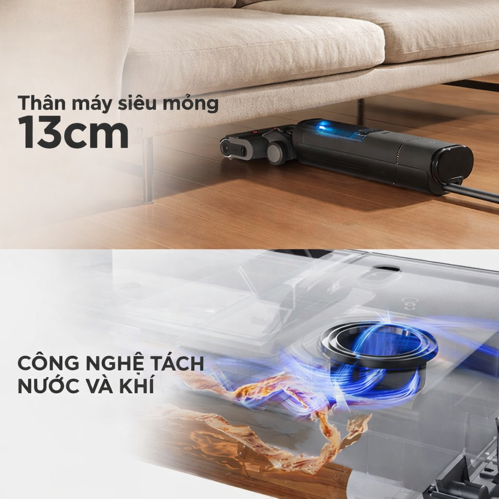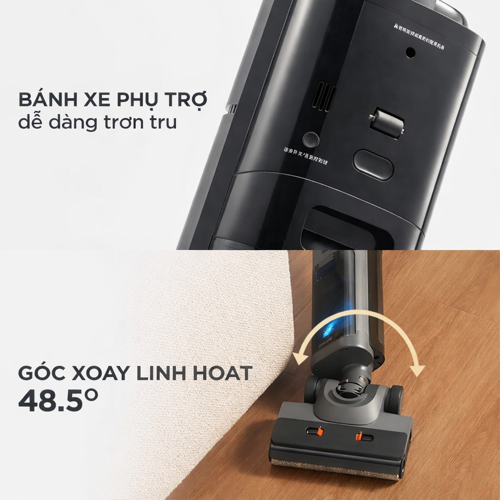 Máy được trang bị công nghệ tách nước – khí hiện đại, giúp phân tách hơi nước nhanh chóng, hạn chế nước thải xâm nhập vào quạt và duy trì lực hút ổn định ngay cả khi máy ở trạng thái nằm phẳng. Hệ thống bánh xe hỗ trợ khi máy nằm giúp giảm lực cản lúc đẩy – kéo, mang lại cảm giác điều khiển nhẹ nhàng và mượt mà hơn. Với góc xoay linh hoạt lên đến 48,5°, máy có thể vừa nằm vừa xoắn để làm sạch hiệu quả khu vực dưới các món đồ nội thất thấp.