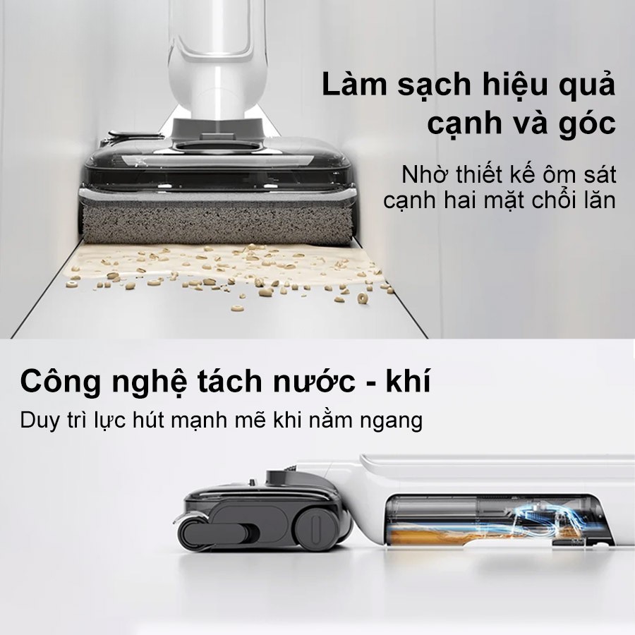 Công nghệ tách nước và khí chủ động giúp máy duy trì lực hút mạnh ngay cả khi hoạt động ở tư thế nằm ngang, đồng thời tối ưu dung tích bình chứa nước bẩn. Thiết kế chổi lăn ôm sát hai cạnh cho phép vệ sinh triệt để dọc chân tường, góc bàn và các khe hẹp, mang lại không gian sạch toàn diện từ sàn chính đến từng chi tiết nhỏ.