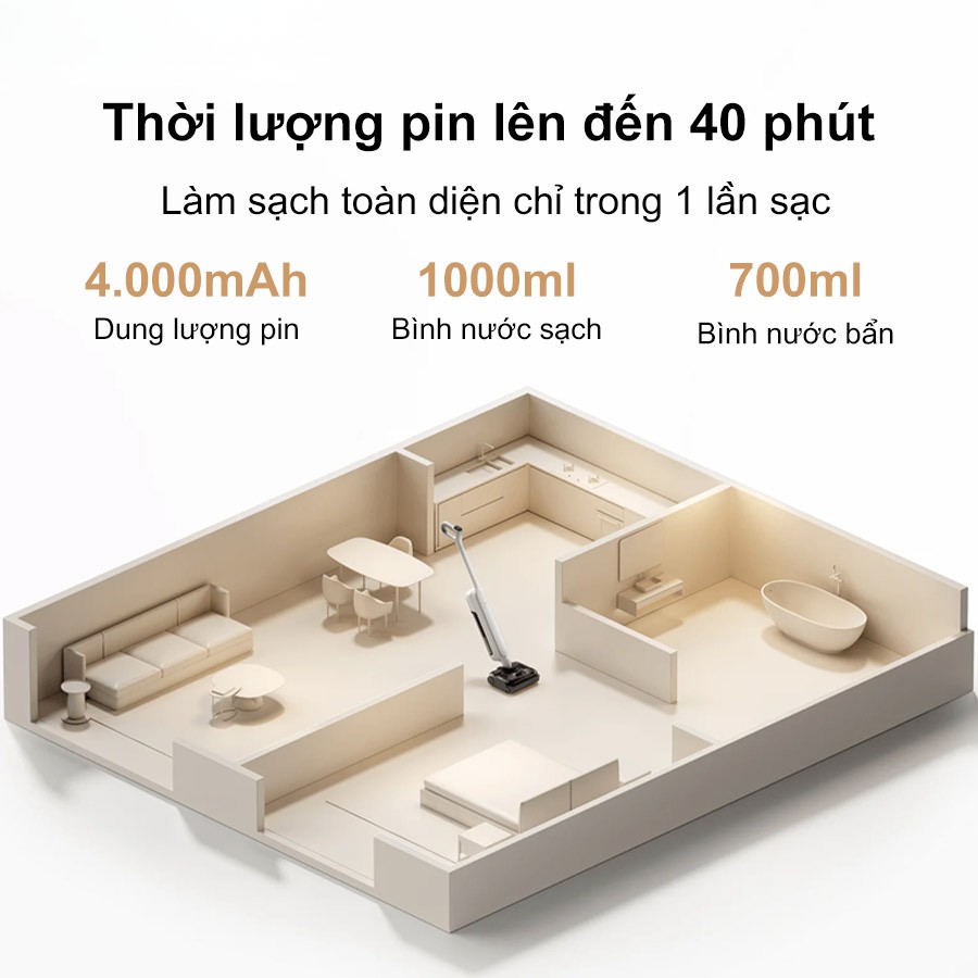 Máy hút bụi lau nhà Xiaomi Truclean W30 Pro trang bị pin dung lượng cao 4.000mAh, cho thời gian sử dụng lên đến 40 phút, đủ để làm sạch cả ngôi nhà lớn chỉ với một lần sạc. So với các dòng máy thông thường, tuổi thọ pin tăng 33%, cho phép dọn dẹp liên tục mà không bị gián đoạn.