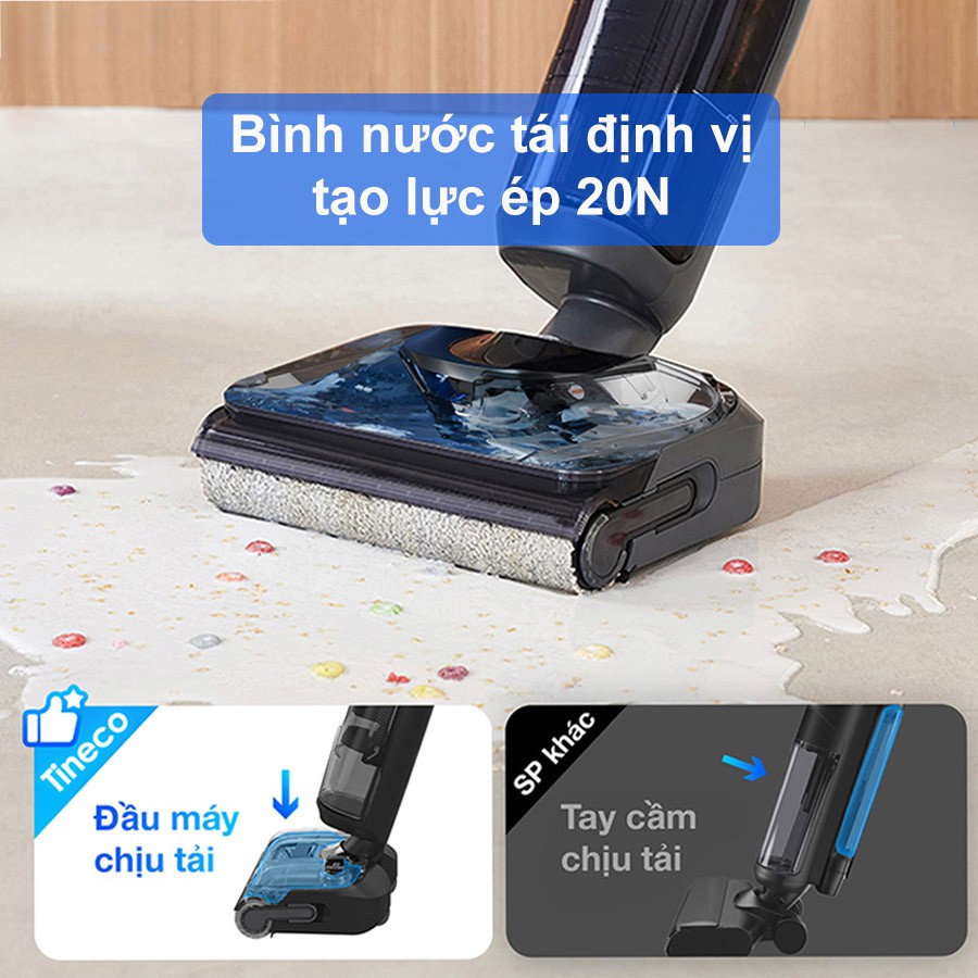 Bình nước sạch của máy hút bụi lau sàn khô ướt Tineco FLOOR ONE S6 Stretch Extreme được bố trí lại để tạo lực ép trực tiếp xuống bề mặt sàn, qua đó nâng cao khả năng xử lý các vết bẩn bám chặt. Nhờ thiết kế này, áp lực cọ rửa được tăng thêm 20N, giúp làm sạch nhanh và hiệu quả hơn mà không cần dùng lực tay nhiều. Đồng thời, kết cấu mới cũng giúp giảm áp lực lên tay cầm, mang lại cảm giác điều khiển nhẹ nhàng và thoải mái ngay cả khi vệ sinh trong thời gian dài.