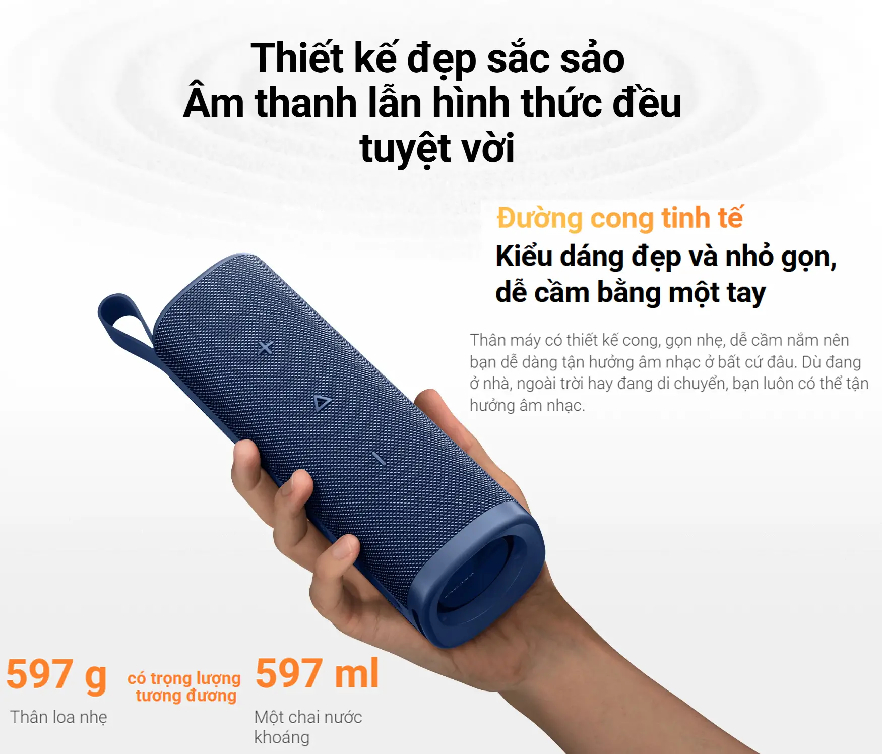 Không chỉ ấn tượng về âm thanh, Loa Bluetooth Xiaomi Sound Outdoor còn nổi bật với thiết kế tinh tế và hiện đại. Lấy cảm hứng từ khái niệm “Sống động”, từng đường nét của loa toát lên sự năng động và hài hòa với nhịp điệu cuộc sống. Thân loa cong thon dài giúp cầm nắm dễ dàng chỉ bằng một tay, trọng lượng 597g tương đương một chai nước khoáng, thuận tiện mang theo trong mọi hành trình. Thiết kế thông minh cho phép đặt loa theo cả chiều ngang lẫn chiều dọc, phù hợp với nhiều không gian và địa hình. Sự kết hợp giữa tông màu đen chủ đạo và chi tiết cam nổi bật tạo nên vẻ ngoài ấn tượng, hiện đại và thể hiện cá tính riêng của người sử dụng.