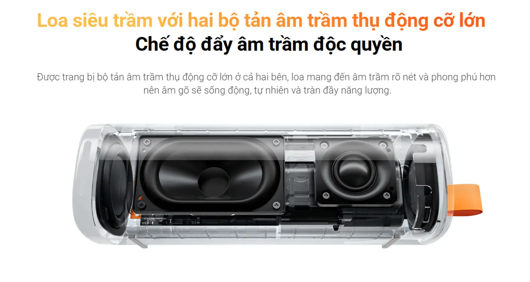Để mang đến trải nghiệm âm thanh sống động, dải trầm (bass) là yếu tố không thể thiếu. Loa Bluetooth Xiaomi Sound Outdoor 30W được trang bị một loa siêu trầm chuyên dụng cùng hai bộ tản âm thụ động lớn đặt đối xứng hai bên, tạo hiệu ứng cộng hưởng mạnh mẽ. Nhờ đó, các nốt trầm trở nên sâu, chắc và có độ nảy ấn tượng. Khi bật chế độ Bass Boost, những tiếng trống hay bassline trong EDM, Hip-hop được tái tạo sống động, tự nhiên và tràn đầy năng lượng. Âm trầm vừa mạnh mẽ, vừa rõ nét, không bị rè hay ù kể cả khi mở âm lượng lớn, mang lại trải nghiệm âm nhạc chân thực và giàu cảm xúc.