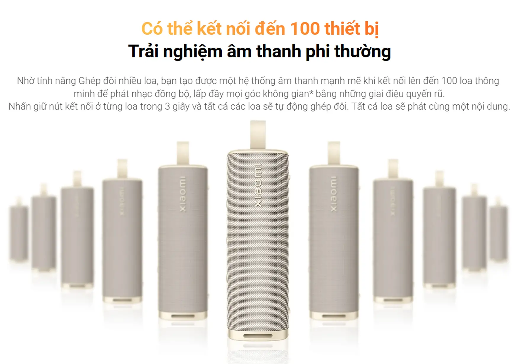 Tính năng Ghép đôi nhiều loa của Xiaomi Sound Outdoor nâng trải nghiệm nghe nhạc lên tầm cao mới. Với công nghệ này, bạn có thể kết nối đồng thời đến 100 loa để tạo âm thanh vòm và phát nhạc đồng bộ hoàn hảo. Chỉ cần nhấn giữ nút kết nối trên mỗi loa trong 3 giây, tất cả sẽ tự động ghép đôi và hoạt động như một hệ thống âm thanh lớn. Nhờ đó, bạn có thể lấp đầy mọi không gian rộng lớn – từ sân vườn, hội trường cho đến bãi biển – bằng âm nhạc sống động, biến mỗi chiếc loa thành một phần của dàn giao hưởng âm thanh hoành tráng.