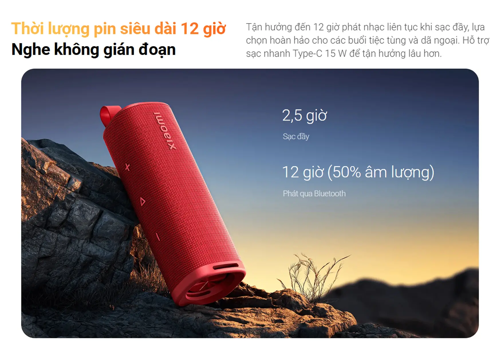 Một chuyến dã ngoại hay buổi tiệc ngoài trời sẽ trở nên trọn vẹn hơn với Loa Bluetooth Xiaomi Sound Outdoor. Nhờ viên pin dung lượng lớn, loa có thể phát nhạc liên tục tới 12 giờ ở mức âm lượng 50%, hoàn toàn đáp ứng cả một ngày dài hoạt động, từ tiệc hồ bơi, dã ngoại đến cắm trại qua đêm. Khi cần sạc lại, cổng Type-C với công suất sạc nhanh 15W giúp rút ngắn thời gian chờ, chỉ khoảng 2,5 giờ là loa lại sẵn sàng tiếp tục khuấy động không gian, đảm bảo cuộc vui không bao giờ gián đoạn.