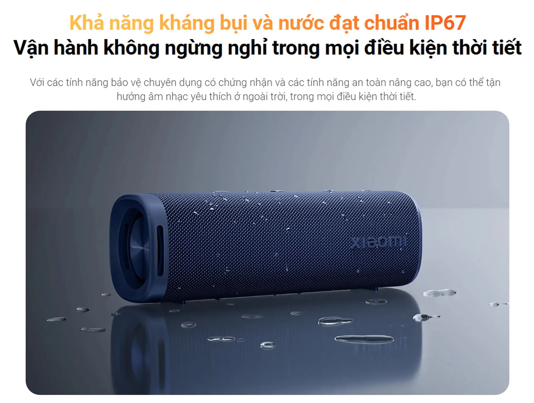 Đối với một chiếc loa ngoài trời, khả năng chống chịu trước các yếu tố môi trường là vô cùng quan trọng. Loa Bluetooth Xiaomi Sound Outdoor 30W đạt chuẩn kháng bụi và nước IP67, đảm bảo sử dụng bền bỉ trong nhiều điều kiện khác nhau. Với “6” trong IP67, loa hoàn toàn chống bụi, lý tưởng để mang theo trên bãi biển hay đường mòn đầy cát. Chỉ số “7” cho phép loa chịu được ngâm nước ở độ sâu 1 mét trong 30 phút. Nhờ khả năng bảo vệ này, bạn có thể tận hưởng âm nhạc bên hồ bơi, dưới cơn mưa bất chợt hay trong những điều kiện thời tiết khắc nghiệt mà không lo hỏng hóc, biến loa Xiaomi Sound Outdoor 30W trở thành người bạn đồng hành đáng tin cậy trong mọi cuộc phiêu lưu.