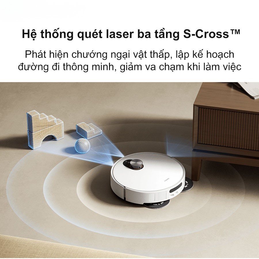 Robot hút bụi lau nhà Xiaomi Vacuum 5 sử dụng hệ thống quét laser ba tầng S-Cross™, kết hợp radar thu gọn và cảm biến cạnh viền. Nhờ đó, robot có thể nhận diện chướng ngại vật thấp theo thời gian thực, quét 360° toàn bộ khu vực và tạo bản đồ làm sạch một cách nhanh chóng, chính xác.