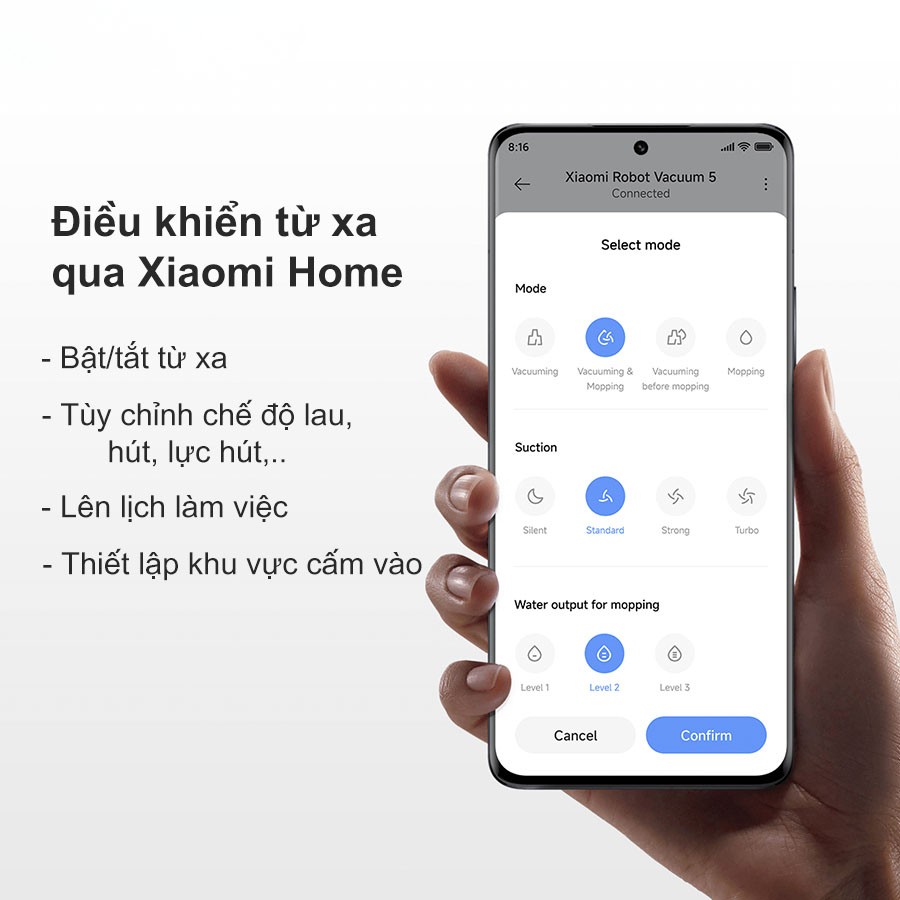 Robot hỗ trợ điều khiển bằng giọng nói cùng nhiều tính năng tiện lợi khác, đồng thời cho phép người dùng quản lý mọi thao tác từ xa qua ứng dụng Xiaomi Home.