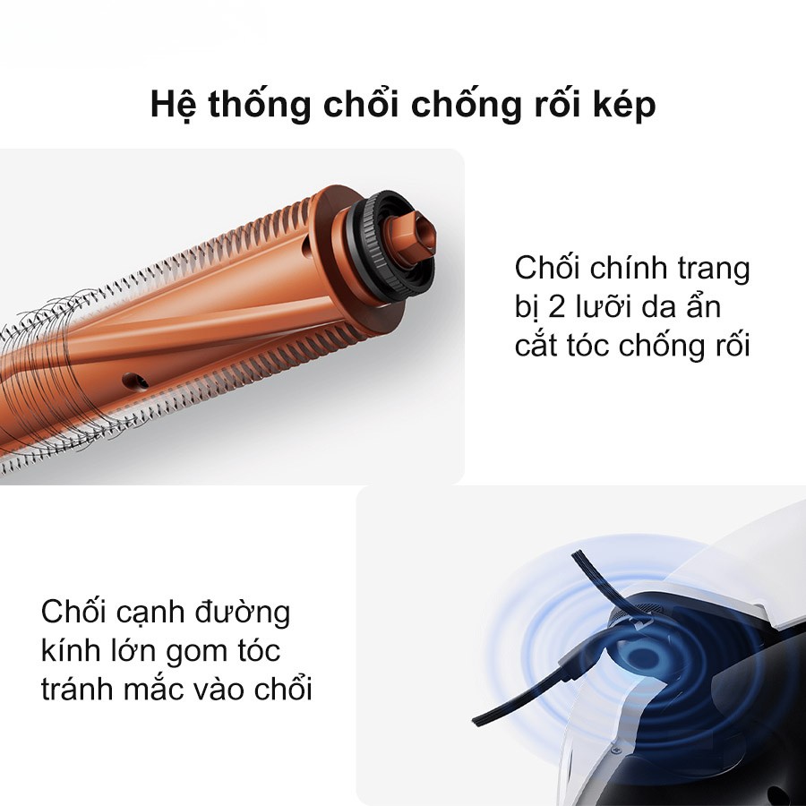 Để khắc phục tình trạng tóc và lông thú dễ mắc vào chổi, robot được trang bị hệ thống chống rối hiện đại. Chổi chính sử dụng lưỡi dao kép ẩn, có thể tự động cắt và hút tóc ngay trong lúc vận hành, giúp giảm thiểu tối đa việc phải tháo chổi ra để gỡ rối thủ công.
