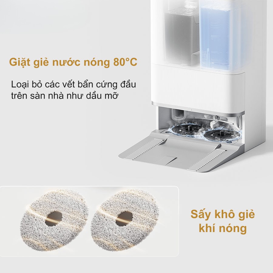 Trạm sạc đi kèm hỗ trợ quy trình tự động hoàn toàn với khả năng vệ sinh, giặt, sấy và thu gom rác toàn diện. Giẻ lau được giặt bằng nước nóng 80°C và sấy khô nhanh, đảm bảo vệ sinh. Hệ thống gạt kép giúp làm sạch đế giặt hiệu quả, còn tính năng thu gom bụi tự động cho phép sử dụng tới 75 ngày mới cần thay túi.