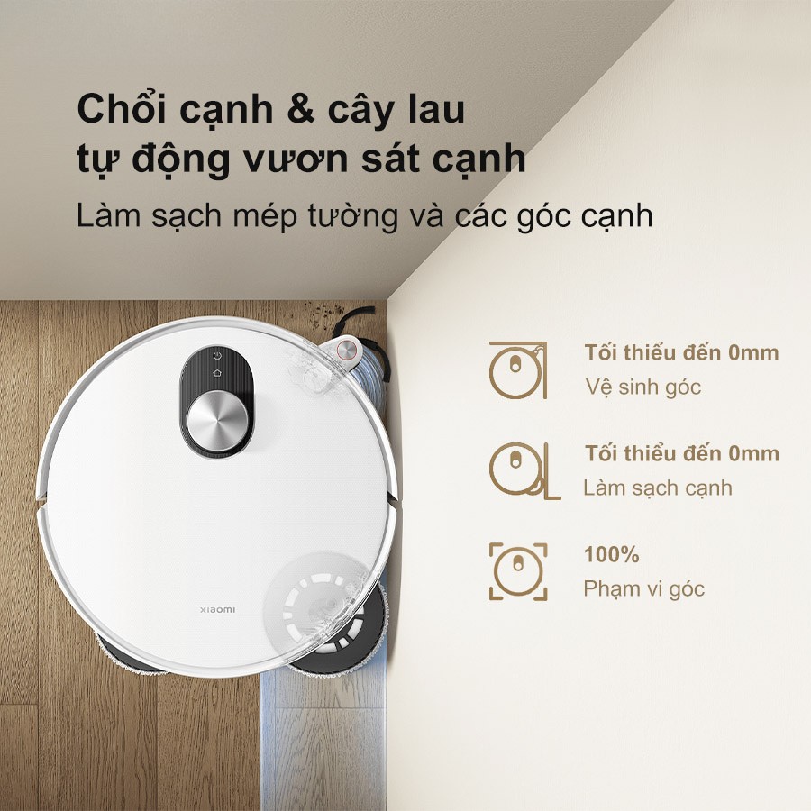 Robot hút bụi lau nhà Xiaomi Vacuum 5 được trang bị giẻ lau và chổi cạnh có khả năng mở rộng linh hoạt, giúp tiếp cận sát tường và những góc hẹp với độ chính xác gần như tuyệt đối (0mm). Nhờ thiết kế này, bụi bẩn bám ở mép tường hay các khe nhỏ khó vệ sinh đều được xử lý sạch sẽ, mang lại không gian sạch sâu hơn trong từng chi tiết.