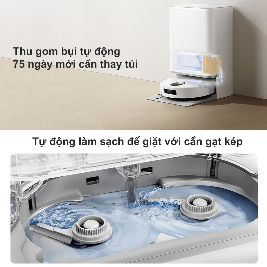Kết hợp với bình chứa nước độc lập và khả năng kiểm soát lượng nước thông minh, robot không chỉ hút bụi mà còn lau sàn hiệu quả, giúp mặt sàn luôn sạch bóng và hạn chế vi khuẩn sau mỗi lần vệ sinh. Theo các thử nghiệm nội bộ, robot có thể đạt mức bao phủ góc cạnh lên đến 100%, mang lại khả năng làm sạch toàn diện cho toàn bộ không gian sống.